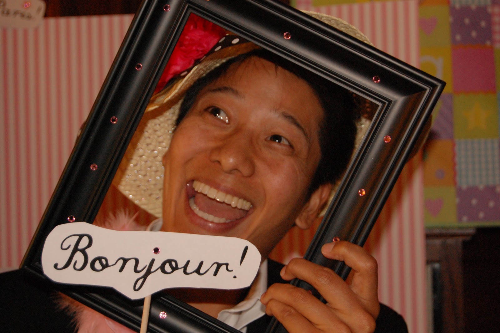 The photo op area was very simple to make. I purchased the tri-fold board from an office supply store and the rest of the items were from the 99 Cents store. The little signs had sayings for people to hold while taking pictures. Some had random phrases that read, “Ooh la la”, “Bonjour!”, etc. The back board should have been much bigger, but the photos were still fun to take. I had a good laugh watching some of the dads goof off with the prop items.